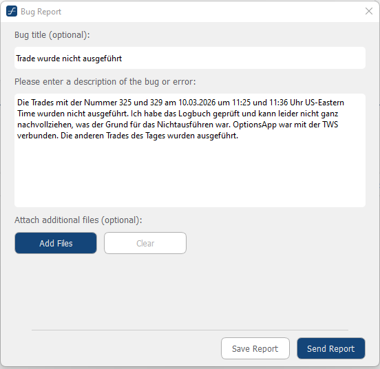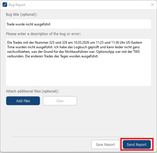 Mit der Option Send Report wird der Bug-Report direkt an das OptionsApp-Team übermittelt.