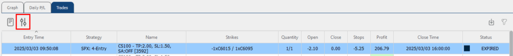 - Wähle den gewünschten Zeitraum sowie die Strategie aus, zu der der betreffende Trade gehört.