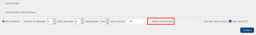 Das Exit Behaviour regelt das Schließen von Positionen über Limit Orders und muss zunächst explizit ausgewählt werden: