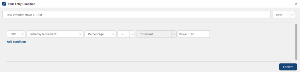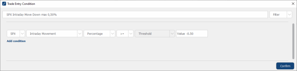 Beispiel: SPX Intraday Movement >= 1,00 % bedeutet, dass der Trade nur eröffnet wird, wenn der SPX seit der Eröffnung mindestens 1 % gestiegen ist.