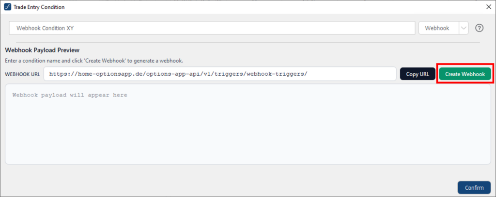 Erst danach ist die Webhook-Condition vollständig in der OptionsApp angelegt.