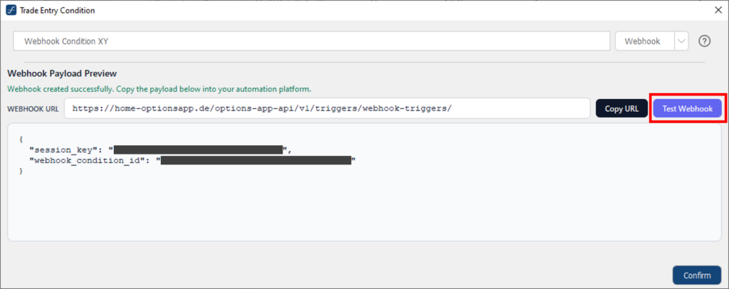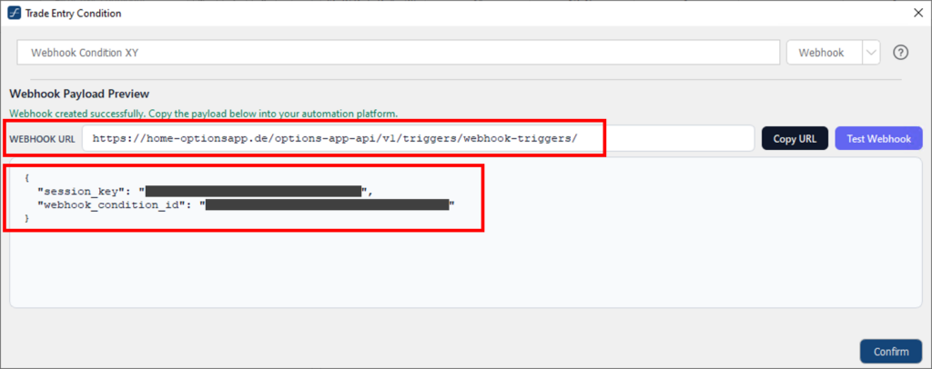 Wird dieser Webhook von einem externen System an die angegebene URL gesendet, kann die OptionsApp das Signal eindeutig der richtigen Session und der richtigen Condition zuordnen.