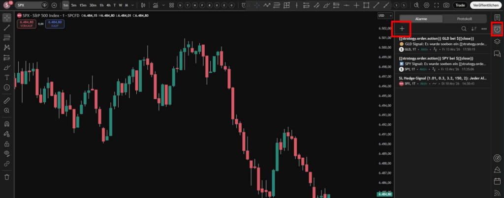 In der Chart-Ansicht von TradingView kann rechts über das Wecker-Symbol ein neuer Alarm erstellt werden.
