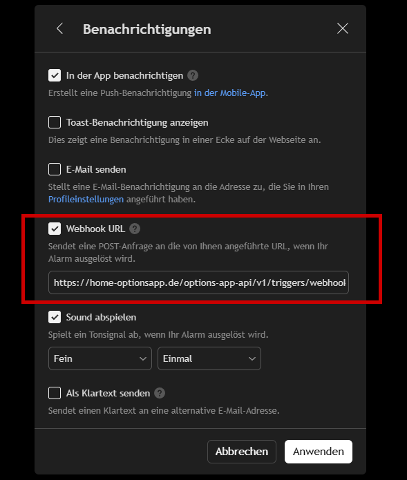 Ein typischer Anwendungsfall für den Webhook ist die Nutzung mit TradingView. Dort kann ein Alarm so eingerichtet werden, dass beim Auslösen automatisch ein Webhook an die OptionsApp gesendet wird.