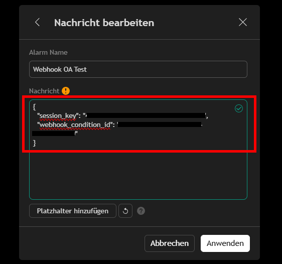 Im Feld Nachricht des TradingView-Alarms muss der Inhalt aus dem Bereich Webhook Payload der OptionsApp eingefügt werden.