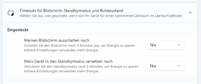 Im Bereich „Timeouts für Bildschirm, Standbymodus und Ruhezustand“ müssen alle Zeitlimits deaktiviert werden.
