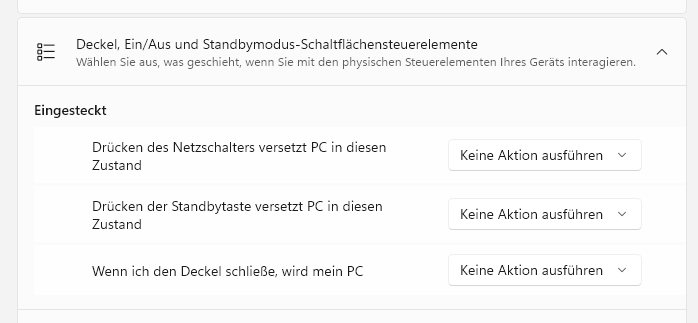 Im Bereich „Deckel-, Ein/Aus- und Standby“ müssen folgende Optionen gesetzt sein: