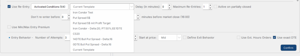 - Alternativ kann ein anderes Template ausgewählt werden, um nach Schließung ein abweichendes Trade Template zu eröffnen (z. B. nach Stop eines Bull Put Spreads, eröffne einen Bear Call Spread).