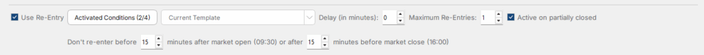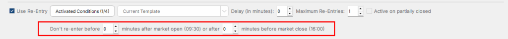 - Don’t re-enter after X minutes before market close: gibt an, wieviel Minuten vor Marktschluss kein Re-Entry mehr ausgelöst werden soll. Hiermit kann verhindert werden, dass noch kurz vor Marktende eine Tradeeröffnung getriggert wird.
