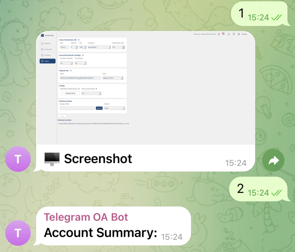 Nach erfolgreicher Einrichtung können die Telegram-Funktionen getestet werden. Wird in der Telegram-Gruppe die Zahl 1 gesendet, antwortet der Bot mit einem aktuellen Screenshot der OptionsApp. Bei Eingabe der Zahl 2 sendet der Bot eine Zusammenfassung des hinterlegten Kontos, beispielsweise den Nettoliquidierungswert sowie weitere relevante Kontoinformationen.