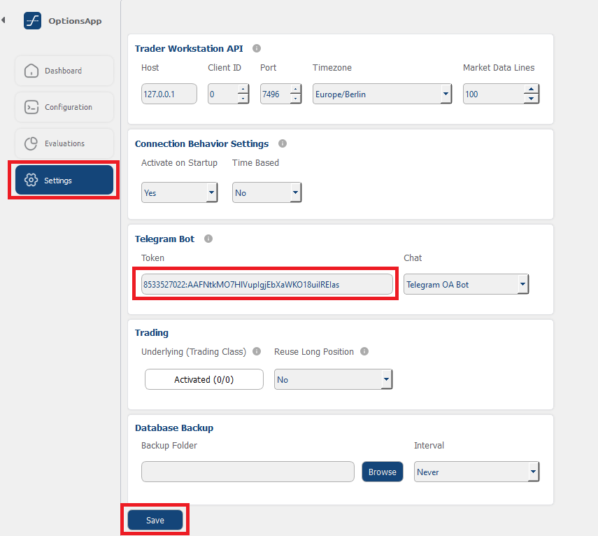 In der OptionsApp wird der Bereich Settings geöffnet und zum Abschnitt Telegram Bot gewechselt. Dort wird der zuvor kopierte API-Token in das Feld Token eingefügt.
