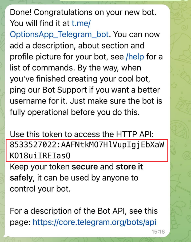 Nach erfolgreicher Erstellung stellt BotFather den HTTP API Token bereit. Dieser Token muss vollständig kopiert und sicher gespeichert werden, beispielsweise durch Versand an den eigenen Computer. Der Token ermöglicht vollständigen Zugriff auf den Bot und darf nicht an Dritte weitergegeben werden.