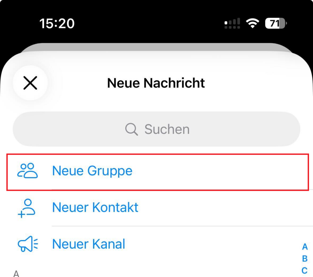 In Telegram wird auf der Startseite oben rechts das Erstellen-Symbol verwendet und anschließend die Option Neue Gruppe ausgewählt.