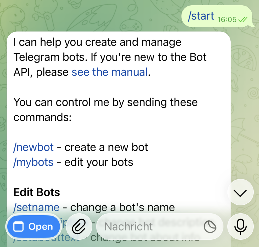 Nach dem Öffnen des Chats mit BotFather wird der Befehl /start gesendet. BotFather zeigt anschließend eine Übersicht der verfügbaren Befehle an.