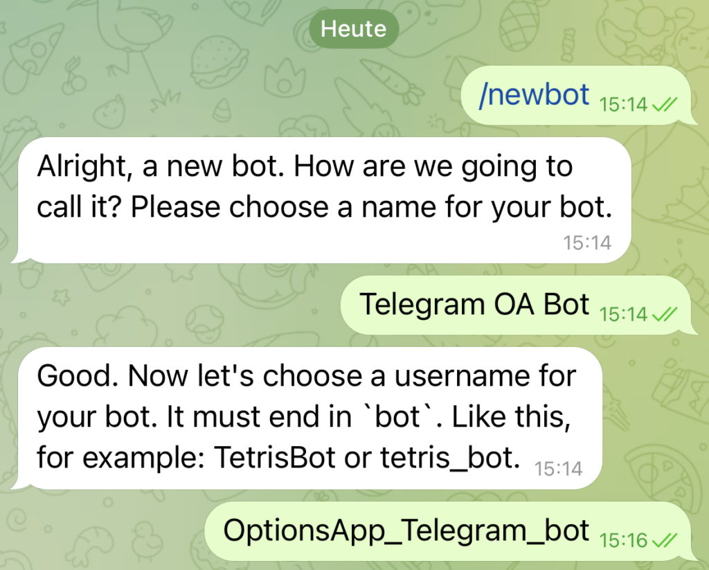 Im nächsten Schritt wird ein eindeutiger Benutzername abgefragt. Dieser Benutzername muss mit bot enden, beispielsweise OptionsApp_Telegram_bot, und weltweit eindeutig sein. Ist der gewünschte Benutzername bereits vergeben, wird er von BotFather abgelehnt. Erst nach Eingabe eines gültigen Benutzernamens wird der Bot erfolgreich erstellt.