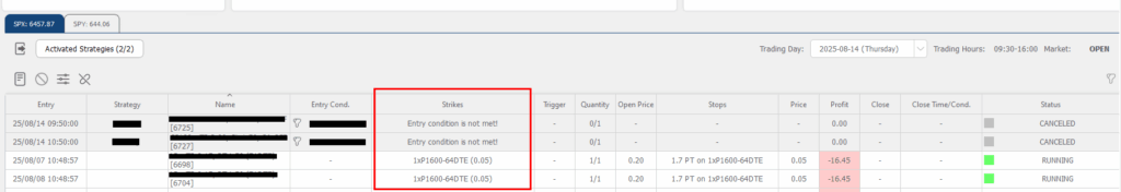 Im Dashboard der OptionsApp bietet die Spalte „Strikes“ eine schnelle Übersicht zum Status der Trades. Dort wird nicht nur der Strike / die Strikes eines laufenden Trades angezeigt, sondern auch, warum ein Trade nicht ausgeführt worden ist.